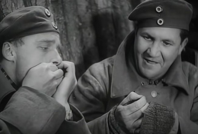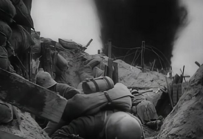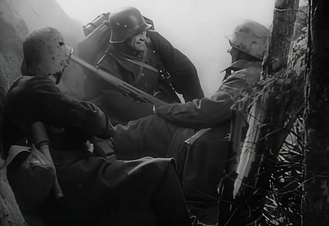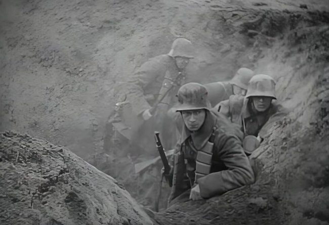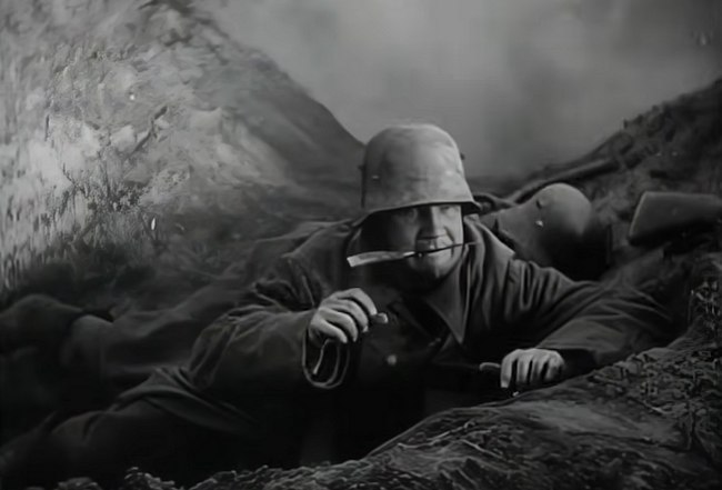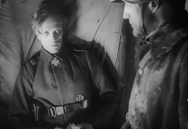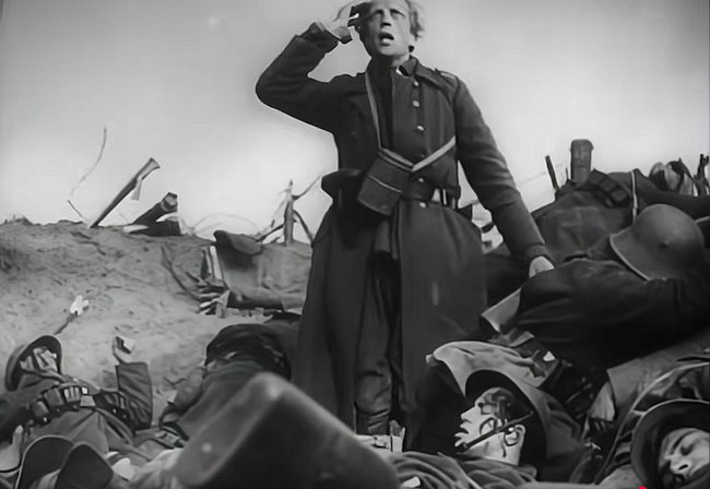 Hier feiert nicht das Heldentum, sondern die Monotonie des Schlachthauses fröhliche Urständ‘. Jeder Tag im Schützengraben ist entsetzlich gleich. Nahezu ununterbrochen regnet es Granaten nieder, ab und zu gefolgt von einem französischen Angriff. Pabst nutzt die Kraft des erst rund ein Jahr zuvor eingeführten Tonfilms und kreiert eine brodelnde Symphonie des Wahnsinns, instrumentiert durch Kanonen und Maschinengewehre. Das Land ist eine gesichtslose Wüstenei, von Stacheldrahtverhauen und Granattrichtern überzogen. Es geht nicht um Sieg oder Niederlage, sondern nur darum, sich nicht als Nächster in das wachsende Heer der Kalten einzureihen. Das Kriegsgeschehen ist ein sinnentleertes Vor und Zurück. Der Tod kommt anonym: Die Toten finden ihre letzte Ruhestätte in Granattrichtern oder Massengräbern. Prasselt mal kein Artilleriefeuer nieder, hat man wenigstens Zeit, sich um die Läuse zu kümmern.